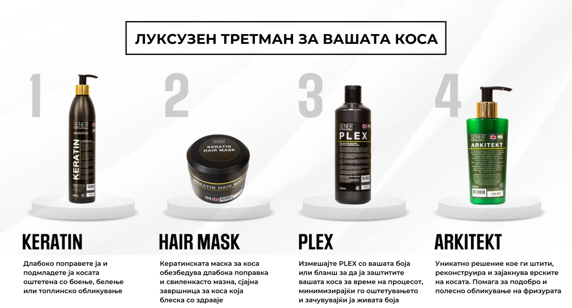 Së pari, aplikoni shampon me keratin dy herë, dhe më pas aplikoni maskën e keratinës në flokë të lagur. Lëreni maskën e keratinës për kohën e rekomanduar, zakonisht 5-10 minuta (mos e shpëlani maskën). Më pas aplikojeni Sener Plex Treatment mbi maskën e keratinës dhe lëreni të veprojë për 5 minuta. Lani flokët dhe në fund thjesht thani flokët.